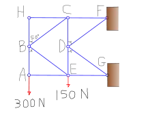When joint H is analyzed it is found that the force in members and must be zero. The reason why neither member can carry any load is that member can only take a vertical load and member can only take a horizontal load. In a real world application this structure might be useful if there was a load applied at joint . Now joint can be analyzed.