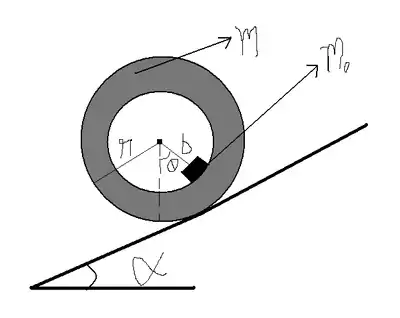A uniform ring of mass and radius carries an eccentric mass at a radius and is in equilibrium position on an incline, which makes an angle with the horizontal. If the contacting surfaces are rough enough to prevent slipping, write the expression for the angle which defines the equilibrium position.