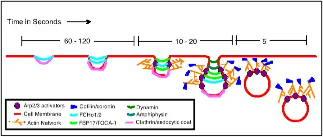 The figure shows a basic actin assembly model that is particular to helping the endocytosis of mammalian cells, although the model for yeast actin assembly is quite similar. In yeast it has been proven that actin is always required for endocytosis, but this mammalian endocytosis only needs actin under certain conditions: for instance when the thing being ingested by the cell is very large or when the location of endocytosis is already rich with actin microfilaments.