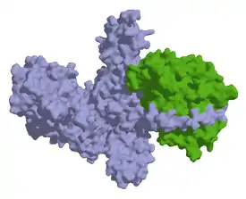 Corynebacerium Diphtheriae consists of two subunits. Subunit A contains an NH3+ group and is responsible for the enzymatic activity during the inhibition of EF-2. This inhibition interferes with the protein synthesis, resulting in cell death. Subunit B contains a carboxylic acid and a Hinge loop, which permits movement of the regulatory domain. Subunit B allows the toxin to bind to the membrane of a target host cell. This subunit possesses a region, known as T (translocation) domain, which is inserted into the target cell’s membrane, thus ensuring the release of Fragment A (catalytic component of the toxin) into the cytoplasm of the host cell.