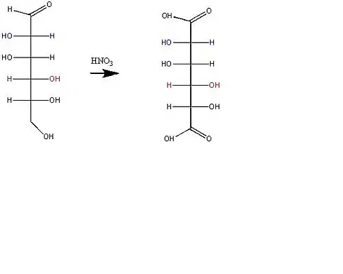 Next, mannose and glucose were oxidized by HNO3. Mannaric acid and glucaric acid were also optically active. With only one unknown stereocenter, there are two possible forms of aldaric acid for each sugar. Out of the four total predictions of glucose and mannose, one of the aldaric acids is meson and therefore cannot be either Mannaric or glucaric acid. Mannaric acid and glucaric acid should have the same stereocenters except for the inverted C2 stereocenter. When one of the models below was rejected, the other model whose C4 is in an S configuration was also rejected. Below, the two circled aldaric acids are mannaric acid and glucaric acid.