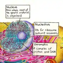 The nucleus is one of the primary organelles that distinguish eukaryotic cells from prokaryotic cells. It is an organelle that enclosed compartment with a specific function. It contains chromatin. Nuclei contains nucleolus (where ribosome assembly is). Ribosomal RNA get together with ribosomal proteins to form the ribosomal subunits. The nucleus contains DNA that house the genes coding for the synthesis of proteins, antibodies and molecules that perform the basic functions of the cell. The nuclear membrane contains nuclear pore conplexes that allow for transport of material into and out of membrane. They also export mRNAs out of the nucleus. [2]