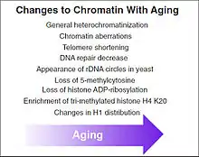 A common feature of aging is random cell-to-cell variation in gene expression. Also, differences in the expression of chromatin modifiers have been found throughout senescence and aging. This changes the distribution and levels of chromatin modifications throughout the nucleus and at aging-associated loci, leading to the activation of age-promoting physiological responses.