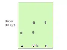 2. If there is only one dark spot for the unknown and it is uncertain whether the spot for compound A is at the same level as the spot for the unknown, one can co-spot both compounds on the TLC plate for a quick check. Co-spot means to spot compound A on one area of the TLC plate and spot the unknown on the same area as the spot of compound A. If there is only one dark spot under the UV light for the co-spotting lane, the identity of unknown is A.