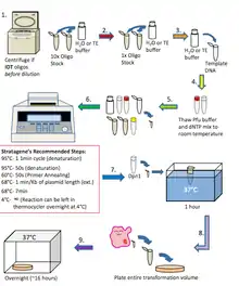 Quickchange is a technique used to generate site-specific mutations with minimal hands-on manipulation. The sites of mutations are incorporated in the two complementary primers and the rest of the plasmid DNA is synthesized with a high fidelity DNA polymerase in a thermal cycler. Therefore the whole process is considered quick.