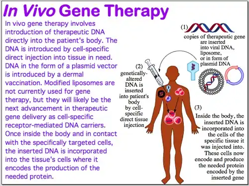 IN VIVO method: cells are genetically-altered inside the body after a genetically-altered vector containing therapeutic DNA is injected into the body.