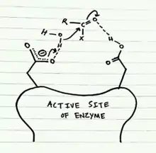On the active sites of aspartyl proteases, there are aspartic acid residues that work together to promote a water molecule to attack the peptide bond. One of the aspartic acid residues (left on the diagram, deprotonated form) will activate the water molecule by attracting the hydrogen atom of water. The other aspartic acid (right on the diagram, protonated form) residue will polarize the carbonyl group on the peptide making it easier to attack. One of the aspartic acids usually has a lower pKa value.