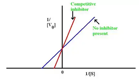 The picture shows a double-reciprocal plot of V0 and [S]. The x-intercept is equal to -1/Km while the y-intercept is 1/Vmax. The slope of the line is Km/Vmax. Thus, the plot shows that there is an increase in Km and no change in Vmax.