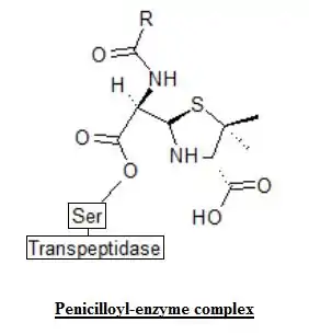 Penicillin-based antibacterials are examples of materials that compete at the active site of an enzyme in an inhibitory fashion. In general, penicillin drugs are used medicinally as antibiotics in the treatment of many bacterial infections; moreover, penicillin drugs derive their antibacterial action due to the fact that they bind irreversibly to bacterial glycopeptide transpeptidase. When unchecked, bacterial infections proliferate, in part, because of their ability to construct cell walls. A key enzyme in the synthesis of bacterial cell walls is transpeptidase. This enzyme plays a critical role in the cross-linking of peptidoglycan strands. Penicillin drugs inhibit the ability of transpeptidase to perform this crucial task. Without the cell wall, bacteria are unable to proliferate, which means the bacteria are essentially destroyed. Mechanistically, in the initial stage of the inhibitory action of penicillin-based drugs, the bond between the carbonyl carbon and the nitrogen atom in the β-lactam ring of the penicillin cleaves. The resulting electrophile is attacked by the newly formed alkoxide ion on the serine residue to form an ester, which results in the final product: a penicilloyl-enzyme complex between glycopeptide transpeptidase and penicillin. It is noteworthy to mention that this complex is stable indefinitely.[1]
