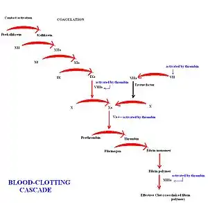 Because of the breakthrough in the elucidation of blood clotting pathways, hemophilia can be revealed early in clotting. Classic hemophilia (a.k.a. Hemophilia A) is a clotting defect. It is genetically transmitted as a sex-linked recessive characteristic. The antihemophilic factor, factor VIII of the pathway is missing or has reduced activity. Even though factor VIII is not a protease, it stimulates the activation of factor X which is the final protease of the intrinsic pathway by the serine protease factor IXa. The activity of factor VIII is increased by limited proteolysis by thrombin. This type of positive feedback amplifies the clotting singal and accelerates clot formation after a threshold has been reached. Therefore the activation of the intrinsic pathway is impaired in classic hemophilia.