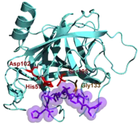 An enzyme that hydrolyzes proteins, cleaving the peptide bond. The inactive form of this enzyme is chymotrypsinogen. The zymogen is synthesized in the pancreas, where most of the secreting proteins are synthesized. Chymotrypsinogen consist of the 245 amino acids. In order to activate it, the bond in between the 15th amino acid (Arg) and 16th amino acid (Ile) has to be cleaved by the enzyme (trypsin). The simple cleavage of the single bond activates the enzyme. Later on, the two dipeptides can be removed to produce α-chymotrypsin. Three chains in α-chymotrypsin are bonded by disulfide bonds. The cleavage of a single bond leads to the structure conformation and creation of the active side of the chymotrypsin (catalytic triad). It also creates a pocket where the aromatic or long hydrophilic side chain of the amino acid can be inserted for the future cleavage. In addition, structural change locates the NH group that stabilized the tetrahedral intermediate in the “oxyanion hole” in the appropriate position.