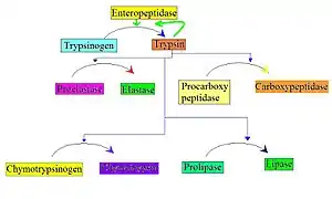 Important enzyme in the biological systems because it activates many enzymes. However, trypsin by itself is activated from the trypsinogen with help of the enteropeptidase. Enteropeptidase is a serine protease just like trypsin and chymotrypsin, and it breaks Lys-Ile bond in the trypsinogen and activates it. As a result of such process, the small amount of the trypsin enzyme is produced. Later, this amount of activated trypsin activates more trypsin and other enzymes too. The formation of trypsin by enteropeptidase is considered the master activaion step since trypsin participates in a variety of zymogen activation. Examples include the activation of proelastase to elastaase, procarboxypeptidase to carboxypeptidase, and prolipase to lipase.