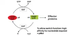 The GTPase Activating Proteins accelerate intrinsic GTPase by a factor of 10^5 to 10^6. Ras, Rap, Rho, Rab, Ran have completely unrelated GAPs. High affinity binding to the GTP-bound form, low affinity interaction with the GDP-bound form.