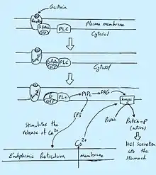 Gastrin is a peptide hormone which is soluble in the water. This hormone plays an important role in the secretion of HCI in stomach. Gastric acid secretion also helps the digestion of protein, the absorption of iron and calcium. In the first, Gastrin activates a particular G protein by attaching to a cell surface receptor in the plasma membrane. Then, the activated G protein binds to another membrane enzyme, phospholipase C (PLC). This enzyme-substrate complex carries out a hydrolysis reaction where hydrolyze phosphatidylinositol- 4,5-bisphosphate (PiP2) to inositol-1,4,5-triphosphate (IP3) and 1,2- diacylglycerol (DAG).