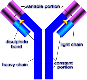 Antibody structures form a related and big group of proteins. All immunoglobins contain four subunits at the least: 2 identical heavy chains (weighing 53-75 kD) and 2 identical light chains (weighing approximately 23 kD). The subunits are attached by disulfide bonds as well as non-covalent interactions to form a Y shaped structure which is symmetric. There are five different classes of immunoglobins (IgA, IgD, IgE, IgG, IgM) differing mostly in the type of heavy chain they contain and sometimes in their subunit structure. As a result, different immunoglobins have different functions. For example, IgE bids to allergens and protects against parasitic worms while IgA is found in mucus and prevents colonization. The most common of th immunoglobins by far is IgG.