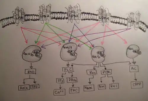Lysophosphatidic acid (LPA) is a small, ubiquitous phospholipid that acts as an extracellular signaling molecule by binding to and activating G protein-coupled receptors. There are about five known G protein-coupled receptors (GPCRs): LPA1, LPA2, LPA3, LPA4 and LPA5. LPA has diverse biological roles such as developmental, physiological, and pathophysiological effects.