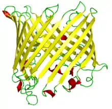 The general structural properties of various porins are the same, regardless of their type. Porins are proteins composed primarily of beta-sheets, connected in the anti-parallel direction. Sixteen to eighteen strands of beta-sheets fold into a cylindrical tube, which is labeled as the beta-barrel. The amino acid sequence is roughly an alternating pattern of non-polar and polar residues, which are positioned in an appropriate way as to generate the tertiary barrel structure. This beta-barrel is located in the lipid bilayer, forming the large hole into the cell. As a result of these interactions, the amino acids facing the outside of the beta-barrel are generally nonpolar, to interact with nonpolar region of the lipid bilayer. However, the inside of the beta-barrel typically contains polar amino acids, to interact with the aqueous environment connecting the two sides of the membrane.