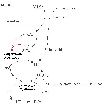 Methotrexate’s chemotherapeutic effects are a result of its ability to limit DNA and RNA synthesis by inhibiting dihydrofolate reductase and thymidylate synthetase. It enters cells through an active transport system used by folic acid. Methotrexate will then undergo polyglumatation. MTXGlu is even more effective in inhibits the enzymes. The enzyme Dihydrofolate Reductase maintains the level of reduced folic acid by reducing dihydrofolic acid which has been produced during thymidylate synthesis. Dihydrofolate reductase reduces folic acid to tetrahydrofolate, an essential co-factor in the synthesis of purine nucleotides.