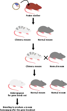 Example: An embryo from a mice in the blastocyst stage of a species with gray fur is isolated. Then the embryonic stem cells are removed from the blastocyst and put on a tissue culture to be grown. Transfer the homologous recombinant gene and grow them in gancyclvir and neomycin. The cells with the new genes for white fur are then transferred back to the blastocyst. Many of the transformed blastocysts will be implanted into pseudo-pregnant mouse with white fur. The mouse will give birth to some white mice and some with patches of gray, showing the activity of the old gene. The mice with the patches - which means they have both the gray fur and white fur genes - will mate with a white mouse. If the gametes of the gray white mouse were from the recombinant stem cells then it will give birth to all gray mice. All of the cells in the mice are heterozygous for the fur gene. The gray mice will then mate together with the heterozygous mice. Identify which mice has the homozygous recombinant and mate them until both of the alleles are knocked out. The end result is the knock out mouse which is when both of the alleles have been knocked out.[7]