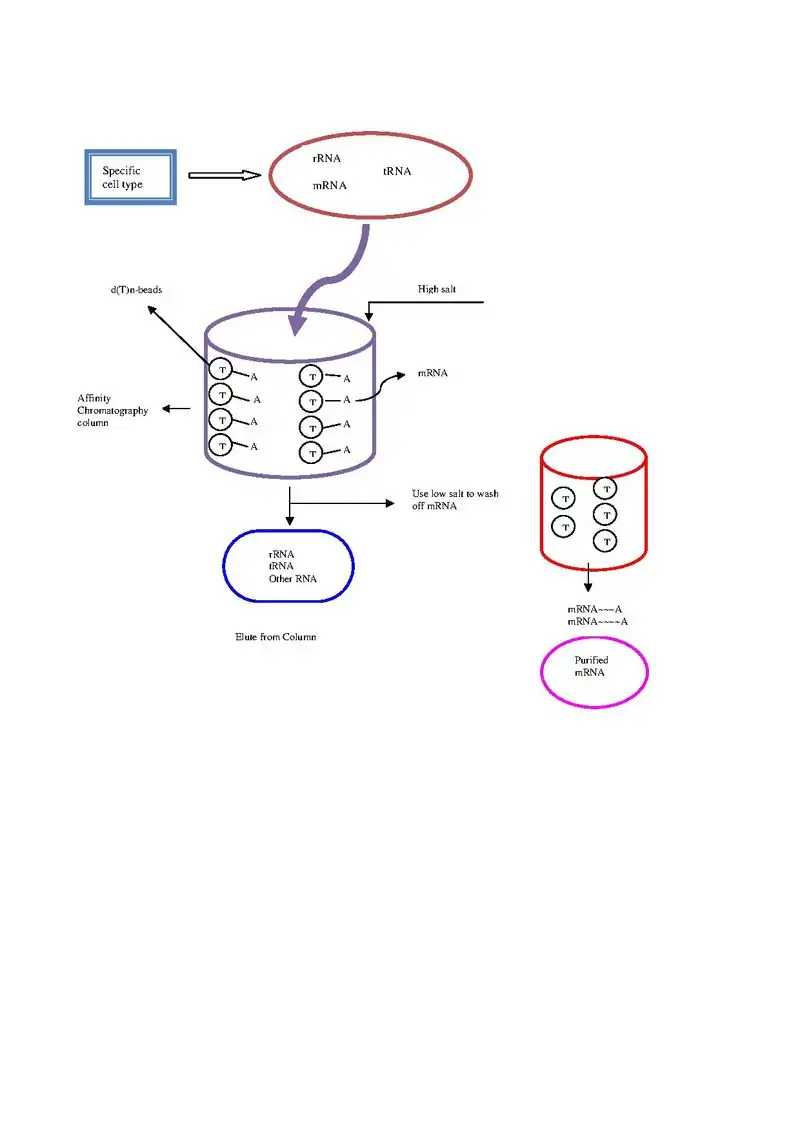This technique exploits the structure of mRNA,which is polyadenylated at the 3' end to form a Poly A tail. The Poly(A)n can pair with the complementary base Poly(T)n through the formation of Hydrogen bonds. The Poly(A) region is used to selectively isolate mRNA from the rest of the RNA via affinity chromatography. Only mRNA with Poly A can be bound by Poly T in the column. RNA that lack Poly A tails elute out of the column at high salt concentrations. The mRNA is separated for other RNAs. Then the Poly(A) mRNA can be washed out from column by adding a low salt eluting buffer.