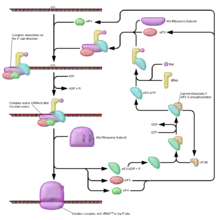 The process of initiation of translation is complete when the large (50S) subunit binds to the Ifs-30S-fmet-tRNA complex. The binding of 50S subunit is an energy requiring process. First the energy rich GTP binds to another protein IF2 (initiation factor 2), forming the GDP-IF2 complex. The GDP-IF2 complex participates in the formation the final protein synthesizing 70S complex. In eukaryotes, additional initiation factors (IFs) are involved.