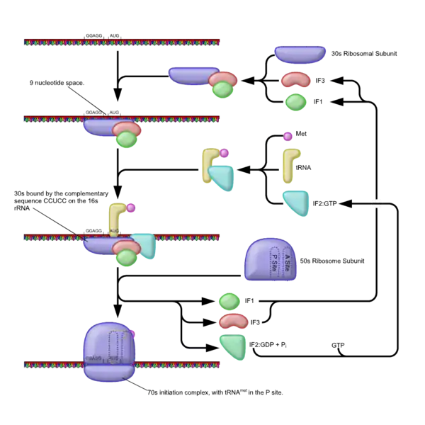 In bacteria, initiation of protein synthesis is started by binding of proteins called initiation factors (IFs) to the small 30S unit. Followed by the binding of fMet-tRNA to it. (fmet is the Met with formamyl (HCOO-) added to the N-terminus which is later removed). The three small proteins called initiation factors (IF1, IF2, and IF3) are required for the initiation of protein synthesis in bacteria. IF3 first brings mRNA and the 30S ribosome subunits together which allow the ribosome-binding site to find its complementary site on the 16S rRNA. Then, IF1 binds to and blocks the A site. The IF2 bound to GTP then escorts the initiator N-formylmethionyl-tRNA to the start codon located at the P site. IF3 is released when the initiator tRNA is in place. The 50S subunit then docks to the 30S subunit, GTP is hydrolyzed and IF1 and IF2 are released as well. This complex of Ifs-30S-fmet-tRNA now binds to the mRNA to be translated. To establish the reading frame, the mRNA in bacteria has an 8 nucleotide, purine-rich sequence called the Shine-Delgarno sequence, which is complementary to the rRNA of the small (30S) unit and helps in the initial binding of mRNA to the 30S unit complex. The Shine-Delgarno sequence is very close to the AUG codon, where the start of the translation occurs. The Shine-Delgarno sequence is present in all the bacteria.
