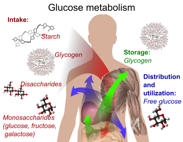 Glucogen Metabolism Glucose metabolism and various forms of it in the process is described by the process below. Glucose-containing compounds are digested and taken up by the body in the intestines, including starch, glycogen, disaccharides and as monosaccharide. Glucose is stored in mainly the liver and muscles as glycogen. It is distributed and utilized in tissues as free glucose.