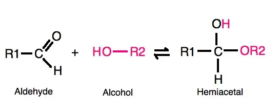 An aldehyde or a ketone can react with an alcohol to yield a hemiacetal or a hemiketal.Hemiacetals and hemiketals are compounds that are derived from aldehydes and ketones respectively. The Greek word hèmi means half. These compounds are formed by formal addition of an alcohol to the carbonyl group. When the alcohol group is replaced by a second alkoxy group, an acetal or a ketal, respectively, is formed. For example, the acetal formation ends with having two ethers on the target carbon, whereas the hemiacetal and hemiketal has both an alcohol and ether group.