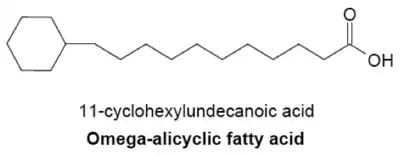 Saturated fatty acids contain single bonds between the carbons of the hydrophobic chain. Saturated fatty acids originate from animals and are found as component chains in a triglyceride molecule. Saturated fatty acids exist in the solid state at room temperature. Unsaturated fatty acids however contain one (monounsaturated) or more (polyunsaturated) double bond(s) between the carbons of the hydrocarbon chain, which causes the molecule to bend. Triglycerides with too many bends cannot be packed as closely together as neutral fatty acids and therefore are less dense. Below is an example of a saturated fatty acid
