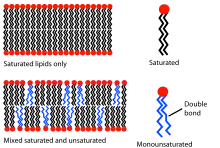 The presence of the lipids in the membrane structure of a cell is vital for the cell especially affecting its fluidity. As addressed in the section below, this is necessary to allow things to flow in and out of the cell. One factor that plays a big role in this is cholesterol as shown below. Another one is the presence of double bonds. The more the double bonds, the greater the amount of kinks or curve in the lipid and therefore more free space.