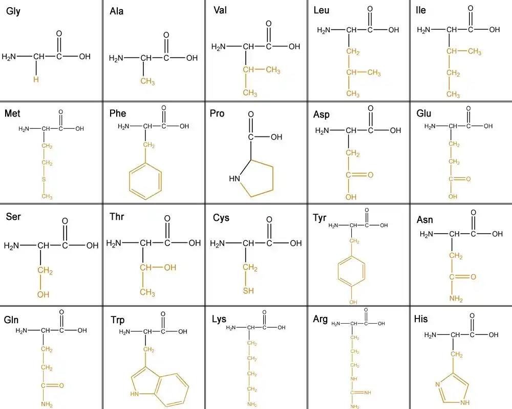 This table shows all the amino acids and the their side chains. From left to right they are: glycine(Gly), alanine(Ala), valine(Val), Leucine(Leu), isoleucine(ILe), methionine(Met), phenylalanine(Phe), proline(Pro), aspartic acid(Asp), glutamic acid(Glu),serine(Ser), threonine(Thr), cystine(Cys), tyrosine(Tyr), asparagine(Asn), glutamine(Gln), tryptophan(Trp), lysine(Lys), arginine(Arg), and histidine (His).