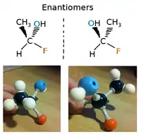 As you can tell from the drawing, on the left, the methyl group is pointing out at us, while the hydroxyl group is pointing back. On the molecule in the right, this order is reversed. This is a prime example of enantiomers.