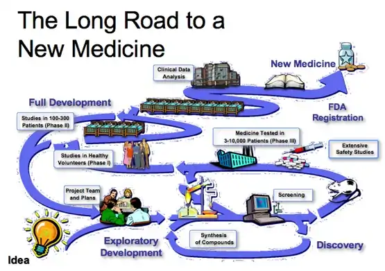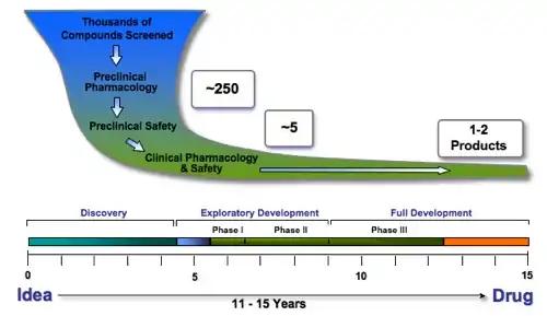 The development of pharmaceuticals is a process with many stages and overall takes at least 12–15 years, usually longer. During the discovery stages of drug research, thousands of compounds may be investigated. This is a labor intensive process that involves individual and team research and planning. Most compounds developed do not become clinically tested drugs. There are many things that could lead to the failure of a particular compound: