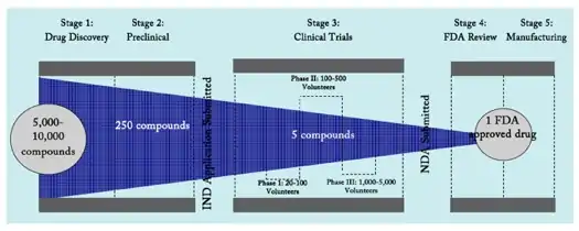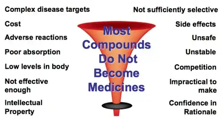 It is not just in the research stage that a potential drug can be rejected. Sometimes even after years of development and progression, a drug can fail in clinical trials or another complication could arise even after much time and money had been invested.