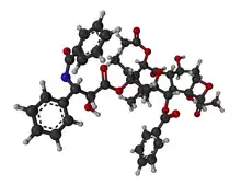 Taxol is a common chemotherapy drug often used for leukemia, and breast, ovarian, brain, and lung tumors. It has very unique biological interactions. It works by inhibiting mitosis by binding to tubulin. It attaches to assembled microtubules and prevents it from disassembling and stopping the cells from regenerating. Other drugs usually kept the tubulin from creating microtubules and while the overall end process is the same, stopping cell division, scientists felt that this may work better in some situations. In 1971 the molecule was extracted from a pacific yew tree's bark. The initial testing of the compound made it a very potent cancer drug. But the bark from one tree produced only enough for one dose of the medicine and the drug was in very short supply. As a solution a relative of the pacific yew, the common yew was found to contain a compound very similar to taxol. With a little bit of chemical manipulation the compound can be converted in to taxol.[10]