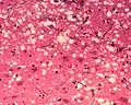 Microscopic "holes" are characteristic in prion-affected tissue sections, causing the tissue to develop a "spongy" architecture.