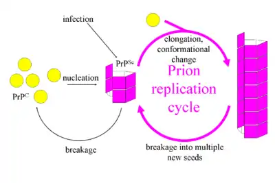 | Fragmentation | PrPSc polymers often fragment, which greatly speeds up the conversion of PrPc to PrPSc. Some co-factors may help in this fragmentation process, which creates new seeds and is essential to the replication process. An example of this is found in yeast, which rely on protein 104 (Hsp104). Removing this protein stops prion replication from occuring. |