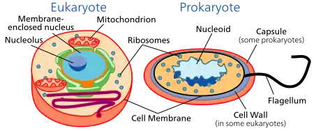 There are many difference between prokaryote and eukaryote cell. In nuclear body of prokaryote, the nuclear body is not bounded by a nuclear membrane while eukaryotic cell have a nuclear that is bounded by a nuclear membrane having pores connecting it with the endoplasmic reticulum. In prokaryote, the cell is covered by cell envelope, a structure varies with type of bacteria, while in eukaryote cell, there is cell membrane to separate the cell from outside environment and regulates movements of materials in and out of the cells. Circular, unorganized DNA molecule is located in nucleoid of prokaryote; on the other hand, linear DNA that is organized by histones is located in nucleus of eukaryote which the protector of nuclear envelope. In prokaryotes, the nuclear body contains a circular chromosome with the lack of histones (unwounded DNA). There is no nucleolus eukaryotic chromosome but a nucleolus, which is present with one or more paired, linear chromosome containing histones. This says that the DNA of eukaryotic cells are organized in nucleus and the DNA of prokaryotes cells are unorganized and floats free in the nucleolus. Eukaryotes sex cell and prokaryotes cell both have flagella, organelle that helps the cell move. Prokaryote's flagella is consist of two protein building block while eukaryote's flagella is complex and consisting of multiple microtubules. Eukaryotes have many organelles in cells such as mitochondria, golgi, lysosomes.... besides ribosomes, there is no organelles in prokaryotes. Prokaryotic cell on average are usually ten times smaller than eukaryotic cell. Cell division in prokaryotic cell and eukaryotic cell is also different. In prokaryotic cell, the cell divided by binary diffusion and prokaryotic cell are haploid. In eukaryotic cell, cell division follows process of mitosis; haploid sex cells in diploid. Cell membrane in prokaryotic cell is a phospholipid bilayer which usually lacking sterols while eukaryotic cell membrane contains sterols. Eukaryotic cell membrane is capable of endocytosis and exocytosis while prokaryote cell is not. Cell wall is present in plant cell, algea, and fungi which belong to eukaryote. Cell wall of eukaryotic cell never composed of peptidoglycan. In prokaryotic cells, a few member of domain bacteria have cell walls which composed of peptydoglycan. Member of domain Archae have cell wall composed of protein or unique molecules resembling but not the same as peptidoglycan. In cytoplasmic structures of eukaryote, the ribosomes are composed of a 60S and a 40S subunit forming an 80S ribosome. Internal membrane-bound organelles such as mitochondria, endoplasmic reticulum, Golgi apparatus, vacuoles, and lysosomes are present. Chloroplasts serve as organelles for photosynthesis. A mitotic spindle involved in mitosis is present during cell division. A cytoskeleton is present. It contains microtubules, actin micofilaments, and intermediate filaments. These collectively play a role in giving shape to cells, allowing for cell movement, movement of organelles within the cell and endocytosis, and cell division. In prokaryote, the ribosomes are composed of a 50S and a 30S subunit forming an 70S ribosome. Internal membrane-bound organelles such as mitochondria, endoplasmic reticulum, Golgi apparatus, vacuoles, and lysosomes are absent. There are no chloroplasts. Photosynthesis usually takes place in infoldings or extensions derived from the cytoplasmic membrane. There is no mitosis and no mitotic spindle in prokaryote but fission and budding only. They may contain only actin-like proteins that, along with the cell wall, contribute to cell shape.