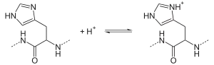 There is a chemical basis that is responsible for the pH effect. The histidine residue of hemoglobin molecule structure is one factor of the pH effect. At high pH, the side chain of histidine is not protonated and the salt bridge between histidine's terminal carboxylate group and a lysine residue, does not form. However as the pH drops, meaning at low pH levels, the side chain of histidine will become protonated and thus form a salt bridge with Aspartate instead. This electrostatic interaction results in a structural change. The formation of salt bridges stabilizes the hemoglobin structure resulting in a lower O2 affinity of hemoglobin and thus increase the tendency for oxygen to be released.