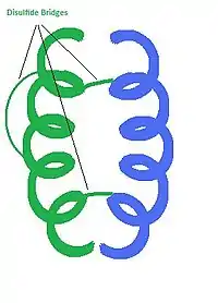 Insulin is a hormone consisting of 2 polypeptide chains. Each chain is composed of a specific sequence of amino acid residues connected by peptide bonds. In humans, chain A has 21 amino acids, and chain B has 30. Post translational modifications result in the connection of these two chains by disulfide bridges. Cysteine residues on A7 and B7, as well as A20 to B19 are covalently connected by disulfide bridges. Chain A also has an internal disulfide bridge connecting A6 to A11. The 3D structure of insulin is composed of 3 helices and the three disulfide bridges. Hydrophobic amino acid residues are clustered on the inside of the molecule while the polar amino acids residues are located on the outer surface. This arrangement of amino acid residues lends stability to the overall molecule. A single molecule of insulin can form a dimer with another insulin molecule, but the most active form is a single unit. The chemical formula for the insulin monomer is: C256H381N65O79S6.