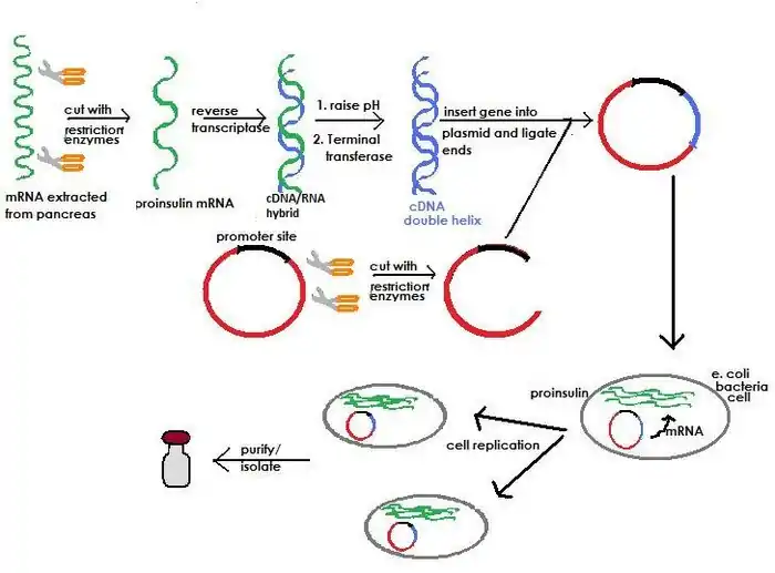 Insulin production takes place in the pancreas, however diabetics lack the capability to produce insulin, so insulin derived by synthetic means is required to maintain normal blood glucose levels. Bovine and porcine insulin is similar to human insulin, however insulin synthesized from these sources can have adverse affects when used to treat diabetic patients due to possible long term effects from the continual injection of a foreign substance into the body. As a result of these possible adverse effects, in 1977, researches at the Genentech corporation developed means to reproduce insulin derived from humans through recombinant DNA technology. The steps involved in cloning human insulin begin with extracting proinsulin mRNA from the pancreas of a human with a functioning pancreas. Next, the enzyme reverse transcriptase is used to synthesize a strand of DNA that is complementary to the proinsulin mRNA. This DNA complement is called cDNA. The cDNA and RNA strands form a double helix hybrid. Next, the RNA is hydrolyzed off by raising the pH, and the DNA strand complementary to the original cDNA strand is formed with the help of an enzyme called terminal transferase. Restriction enzymes can be used to cut the gene and isolate just the sequence that encodes for the insulin protein. Next, circular units of DNA, called plasmids, are extracted from E. coli bacteria cells and cut with the same restriction enzyme that was used to cut the human chromosome. Using the same restriction enzymes creates complementary ends on the plasmid and the insulin gene. Next, the insulin gene is inserted into the plasmid at the proper location and the enzyme DNA ligase is used to form the phosphodiester bonds between the insulin gene and the plasmid. This step essentially “glues” the insulin gene into the E. coli plasmid vector. A certain type of plasmid called an “expression vector” is used in this process, which contains a bacterial promoter that facilitates the formation mRNA. Once the insulin genes are ligated into the vector, the vector is inserted into a bacterial cell. The bacterial cell acts as a host for the translation process of mRNA to protein. These host cells are harvested and allowed to reproduce, which creates a colony of insulin producing bacterial cells. The insulin can then be purified and packaged.