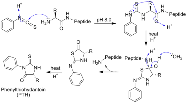To solve the problem of damaging the protein by hydrolyzing conditions, Pehr Edman created a new way of labeling and cleaving the peptide. Edman thought of a way of removing only one residue at a time, which did not damage the overall sequencing. This was done by adding Phenyl isothiocyanate, which creates a phenylthiocarbamoyl derivative with the N-terminal. The N-terminal is then cleaved under less harsh acidic conditions, creating a cyclic compound of phenylthiohydantoin PTH-amino acid. This does not damage the protein and leaves two constituents of the peptide. This method can be repeated for the rest of the residues, separating one residue at a time.