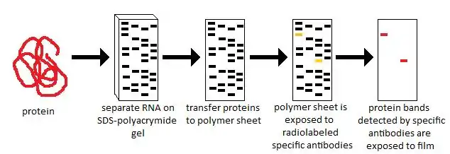 Western blotting, which originated from the laboratory of George Stark at Stanford, is the technique for detecting a particular protein by staining with specific antibody. Its analysis can give us the information about the size of the protein or how much protein accumulated in cells. It does not mean that it can do for any protein since in the case the protein is degraded quickly; it is hard to detect it well. The important thing in this technique is antibody since Western blotting is based on the use of a “quality” antibody as a probe to detect specific protein. In this technique, first we separate the protein by using SDS-poly-acryl-amide gel electrophoresis, which base on the protein’s size. Later, those proteins on the gel are transferred to the surface of a polymer sheet by blotting. As soon as we add antibody that is specific for the desired protein to the sheet, it will bind to this protein since they have nothing else to bind to. Later, we wash unbound primary antibody, and this protein-primary antibody can be detected by secondary antibody. Those secondary antibody can only recognize the primary antibody and many of them bind to one primary antibody and give out the signal, which is a radioactive label on the secondary antibody produces a dark band on X-ray film.