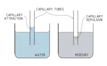 Cohesive: water molecules are attracted to other water molecules. For example, if you place a capillary glass tube open ended into a container with mercury, you will observe a concave down curve because the glass is polar which doesn’t attract with mercury. As shown in the figured.