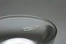 Surface tension is caused by the cohesive intermolecular forces of water with other water molecules at the surface of liquid water. This property can be observed when water forms droplets on a surface, when a curvature forms on the top of a filled cup of water, and when reptiles walk on the surface of water. Surface tension is usually measured in units of force per length (dynes/cm) or units of energy per area (ergs/cm^2).