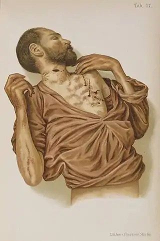 Eduard Ritter von Hofmann (1837-1897): "Lehrbuch der gerichtlichen Medicin." Vienna, 1878. / taken from translation "Atlas of Legal Medicine", Philadelphia 1898. Plate 17: Suidide through stabbing.
