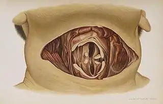 Eduard Ritter von Hofmann (1837-1897): "Lehrbuch der gerichtlichen Medicin." Vienna, 1878. / taken from translation "Atlas of Legal Medicine", Philadelphia 1898. Plate 16: Suicide by cutting the throat. Death through suffocation.