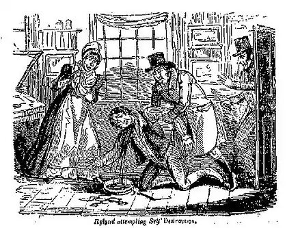 William Wynne Ryland attempting suicide. The Newgate Calendar. Date: 1783.