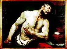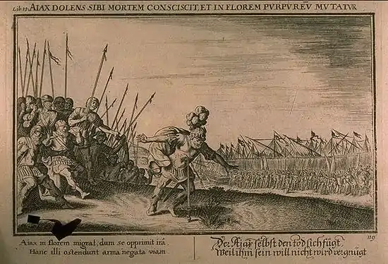 "Cato did not immediately die of the wound; but struggling, fell off the bed, and throwing down a little mathematical table that stood by, made such a noise that the servants, hearing it, cried out. And immediately his son and all his friends came into the chamber, where, seeing him lie weltering in his own blood, great part of his bowels out of his body, but himself still alive and able to look at them, they all stood in horror. The physician went to him, and would have put in his bowels, which were not pierced, and sewed up the wound; but Cato, recovering himself, and understanding the intention, thrust away the physician, plucked out his own bowels, and tearing open the wound, immediately expired."