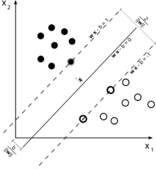 In 1995, Corinna Cortes and Vladimir Vapnik suggested a modified maximum margin idea that allows for mislabeled examples.[3] If there exists no hyperplane that can split the "yes" and "no" examples, the Soft Margin method will choose a hyperplane that splits the examples as cleanly as possible, while still maximizing the distance to the nearest cleanly split examples. The method introduces slack variables, , which measure the degree of misclassification of the datum